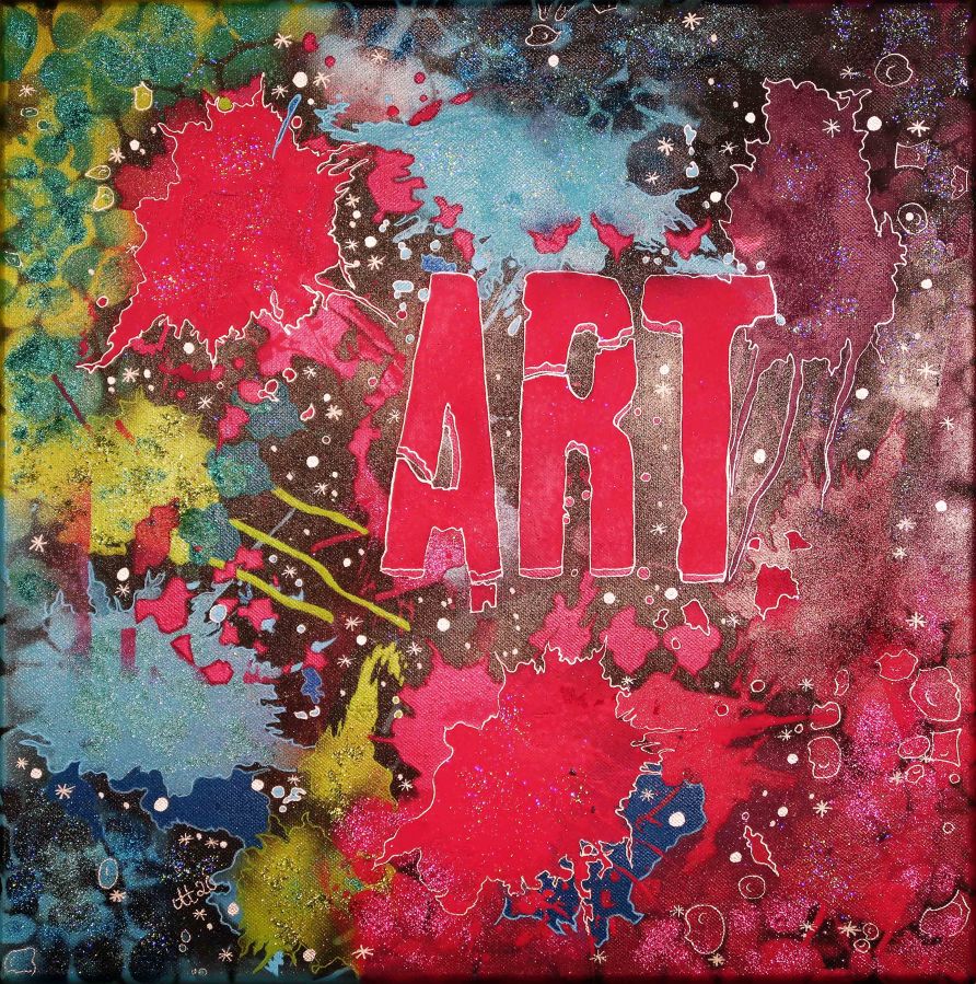 „ART-treu“, 40×40, Acrylfarbe, Acrylstifte, Acrylspray, Glitzerfarbe und Streuglitzer auf schwarzer Leinwand , Preis auf Anfrage.