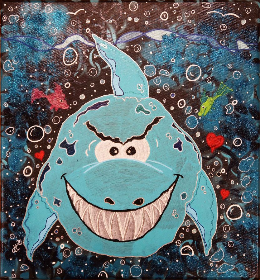 „Hainy Hai“, 30×30, Acrylfarbe, Acrylstifte, Acrylspray, Glitzerfarbe und Streuglitzer auf schwarzer Leinwand , Preis auf Anfrage.
