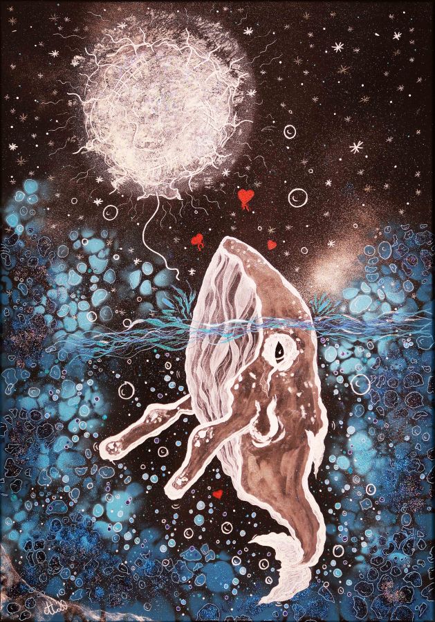 „Träume eines kleinen Wals“, 50×70, Acrylfarbe, Acrylstifte, Acrylspray, Glitzerfarbe und Streuglitzer auf schwarzer Leinwand , Preis auf Anfrage.