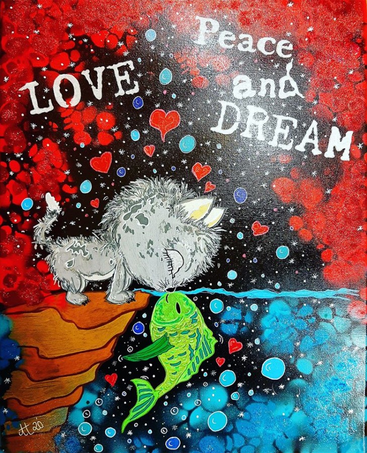 „Eine GANZ besondere LIEBE“, 40×50, Acrylfarbe, Acrylstifte, Acrylspray, Glitzerfarbe und Streuglitzer auf schwarzer Leinwand , verkauft.