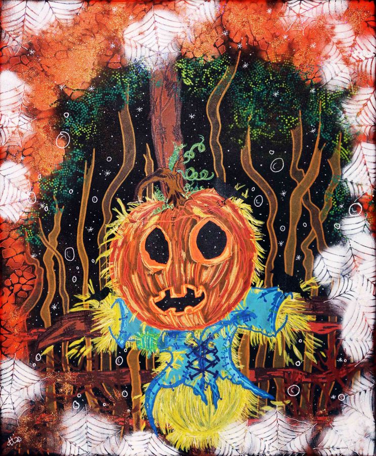 „Mr Scarecrow“, 50×60, Acrylfarbe, Acrylstifte, Acrylspray, Glitzerfarbe und Streuglitzer auf schwarzer Leinwand , Preis auf Anfrage.