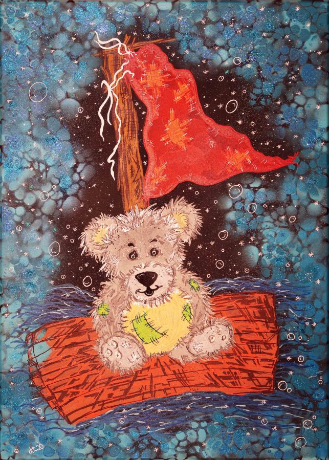 „Der kleine träumende Bär“, 50×70, Acrylfarbe, Acrylstifte, Acrylspray, Glitzerfarbe und Streuglitzer auf schwarzer Leinwand , Preis auf Anfrage.
