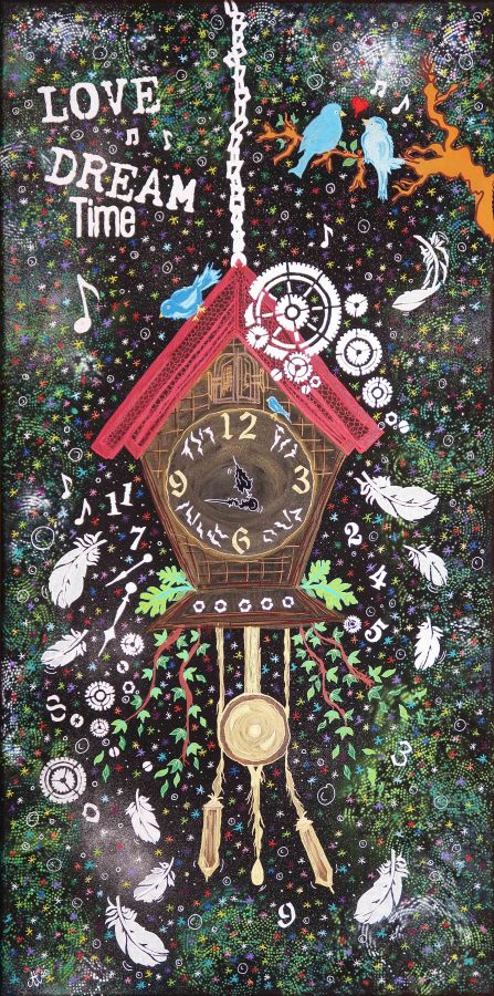 „Der Kuckuck ist ausgeflogen“, 50×100, Acrylfarbe, Acrylstifte, Acrylspray, Glitzerfarbe und Streuglitzer auf schwarzer Leinwand , Preis auf Anfrage.