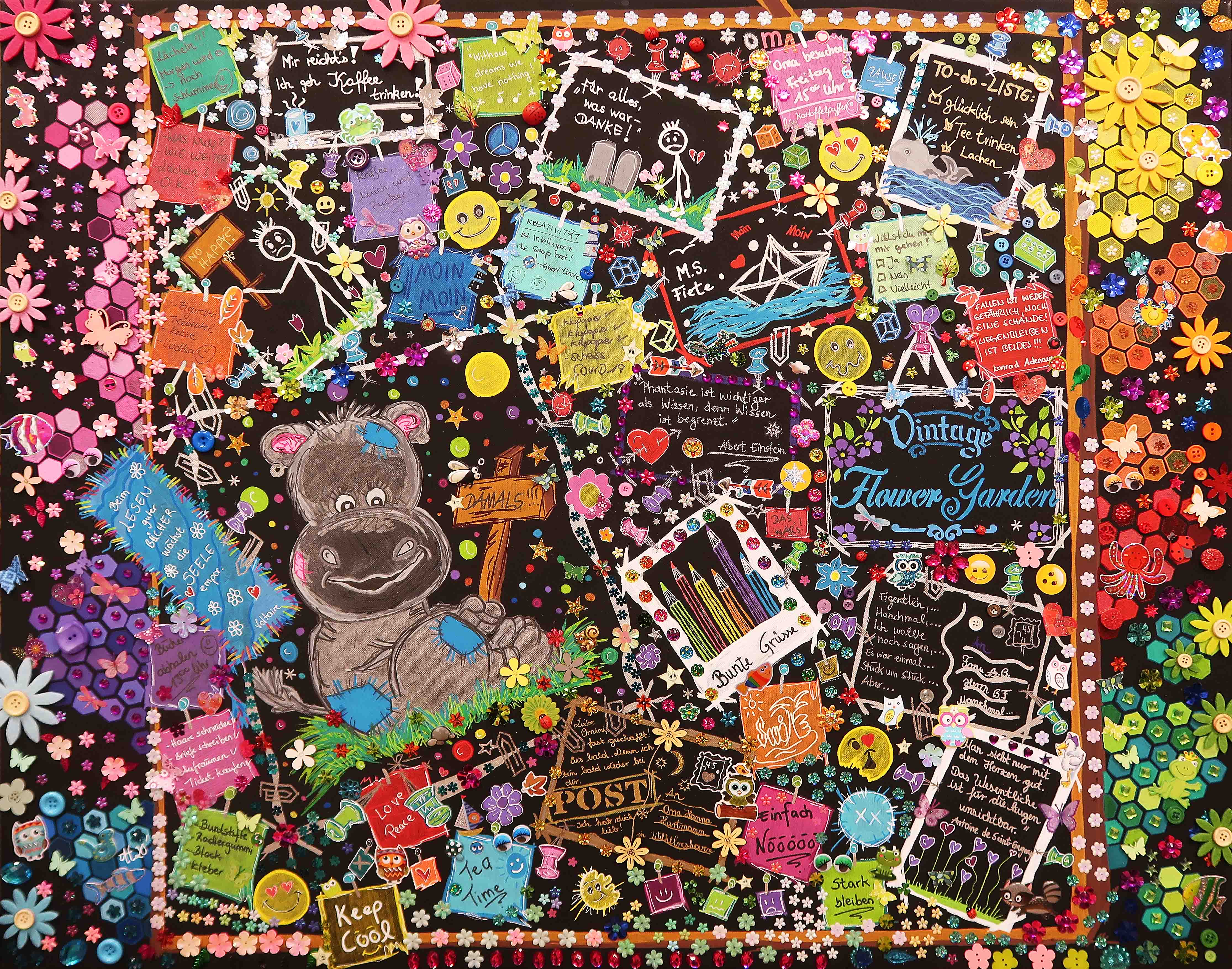 „EIN GANZES LEBEN 4“, 80×100, Acrylfarbe, Acrylstifte, Acrylspray, Glitzerfarbe und Streuglitzer auf schwarzer Leinwand, Preis auf Anfrage.