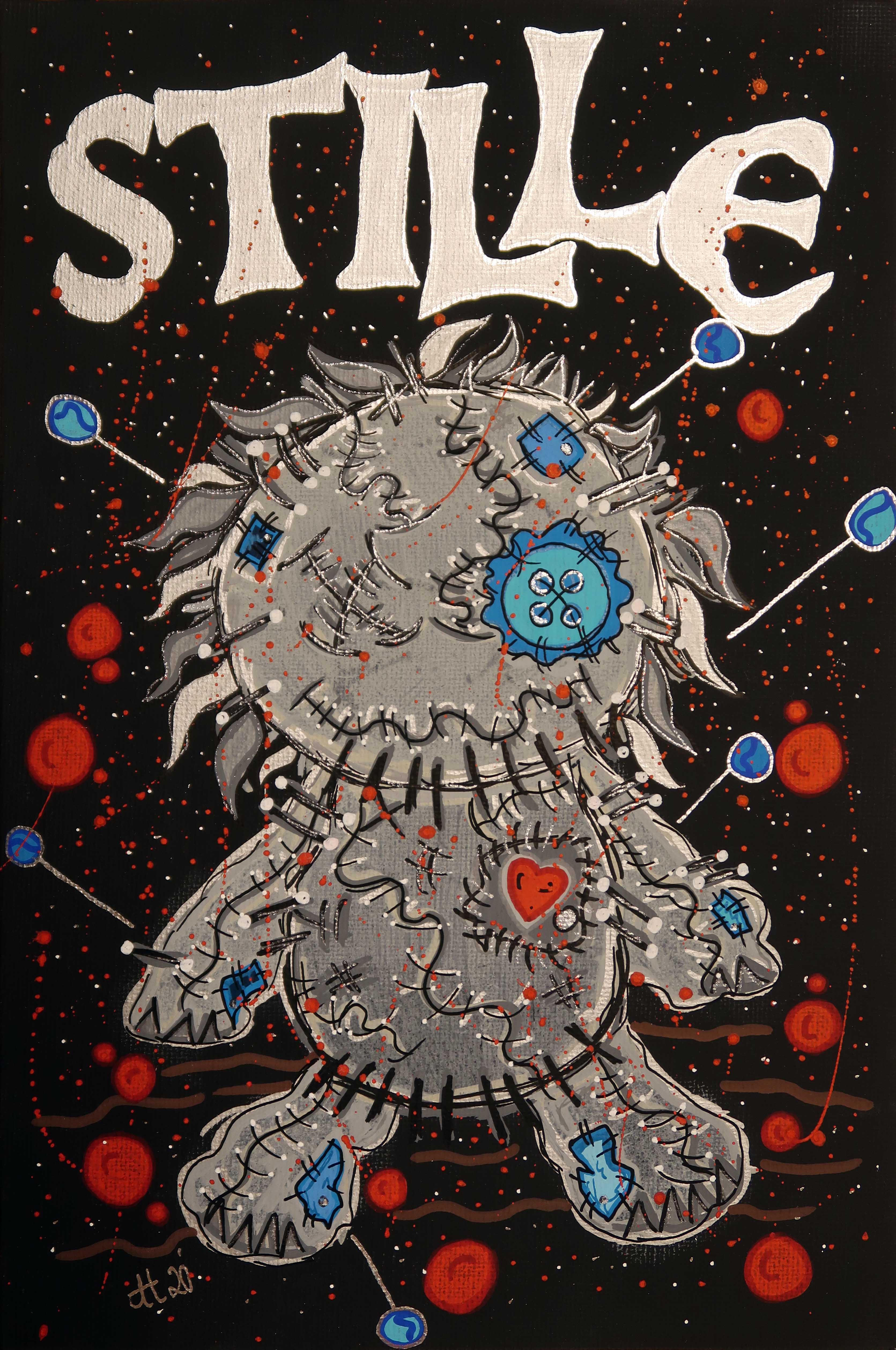 „ESVBM Stille“, 30×20, Acrylfarbe, Acrylstifte, Acrylspray, Glitzerfarbe und Streuglitzer auf schwarzer Malpappe, Preis auf Anfrage.
