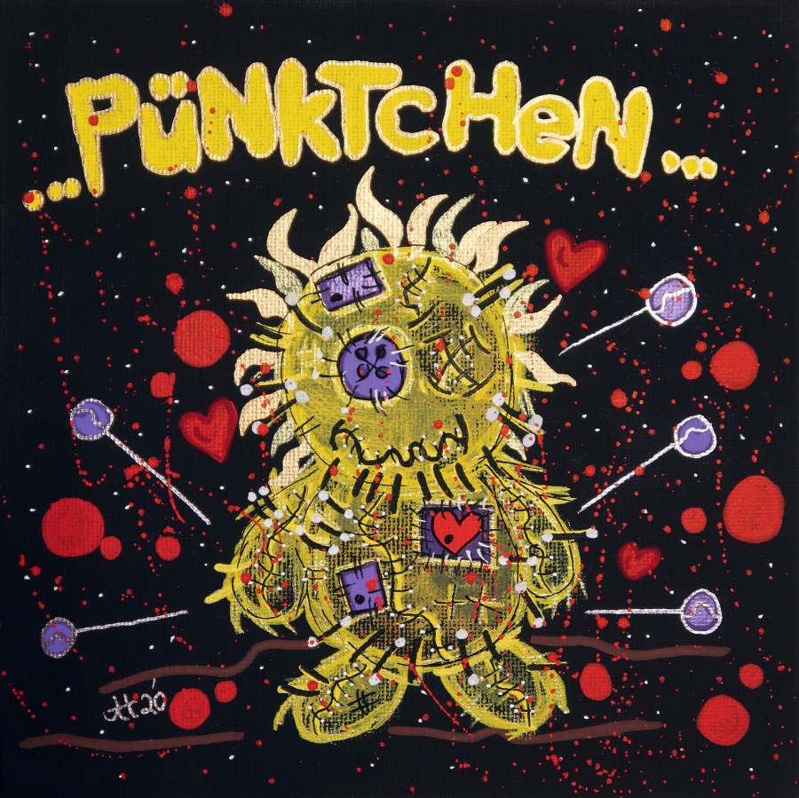 „ESVBM Pünktchen“, 20×20, Acrylfarbe, Acrylstifte, Acrylspray, Glitzerfarbe und Streuglitzer auf schwarzer Malpappe, Preis auf Anfrage.