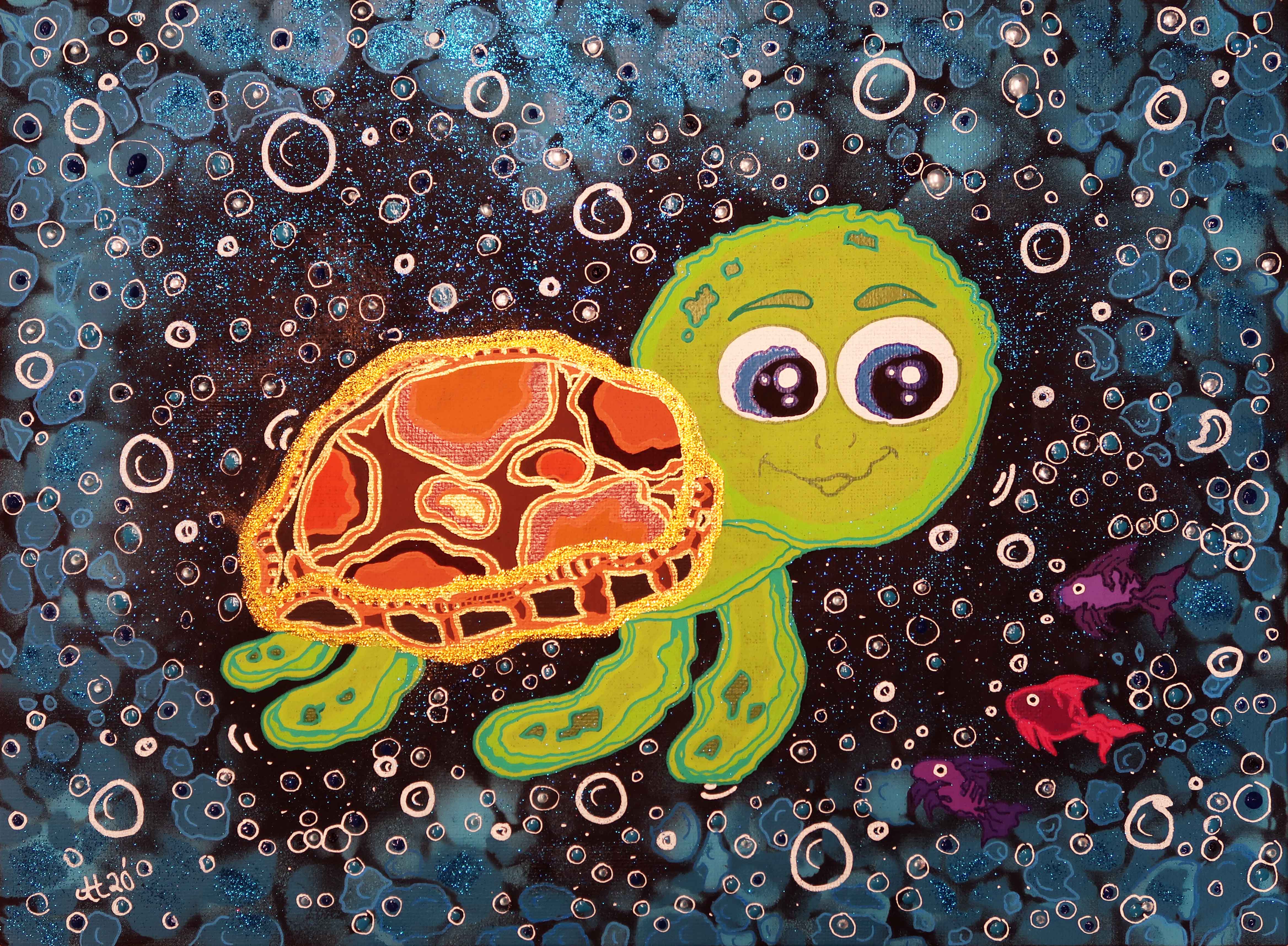 „Kleine Schildkröte“, 30×40, Acrylfarbe, Acrylstifte, Acrylspray, Glitzerfarbe und Streuglitzer auf schwarzer Malpappe, Preis auf Anfrage.