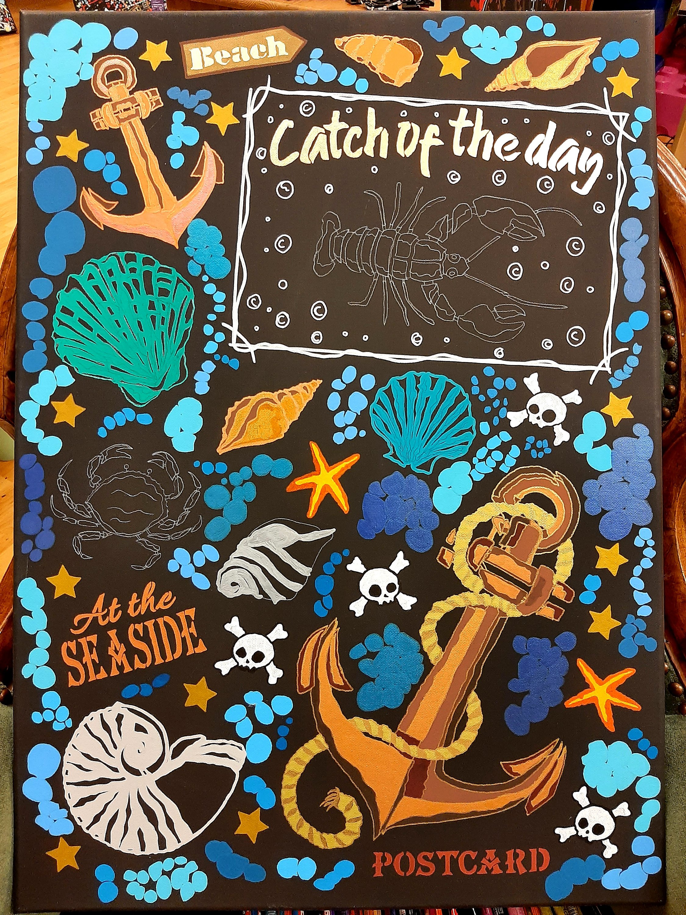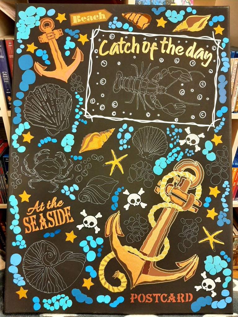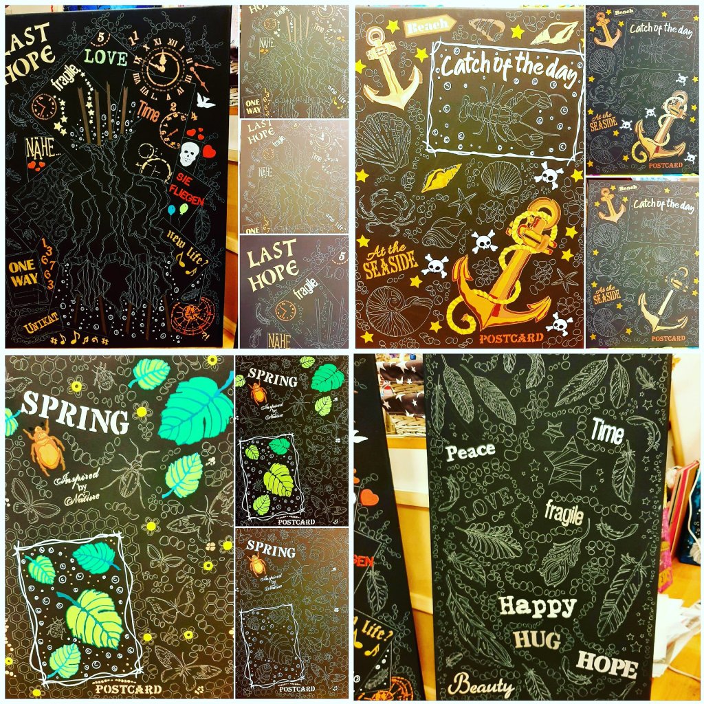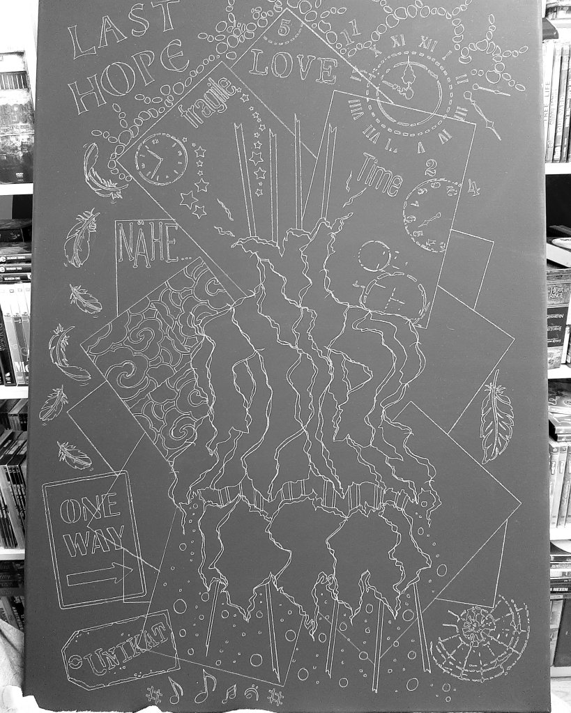 Bisher Acrylstifte und Metallic Marker auf schwarzer Leinwand