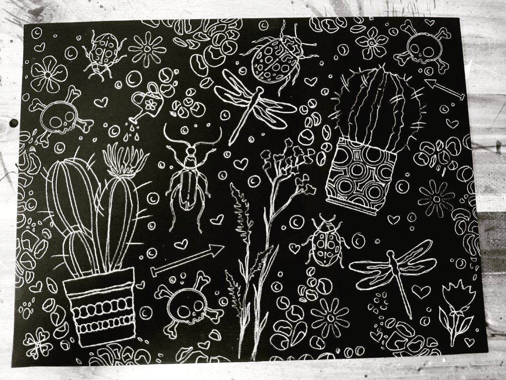 Acrylstifte und Grafik Liner auf schwarzer Malpappe