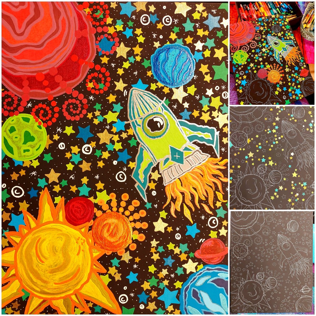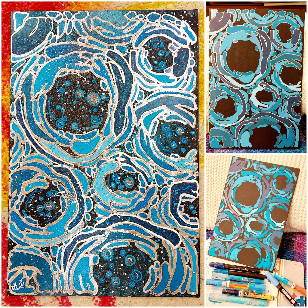 Bisher Acrylstifte, Grafik Liner und Metallic Marker auf schwarzer Malpappe