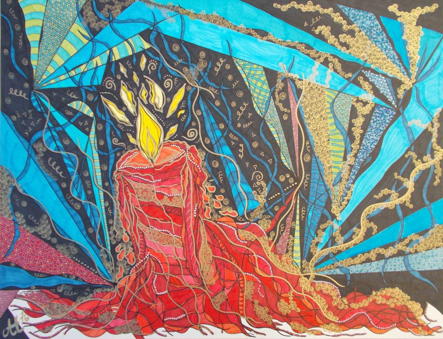 „Aufflammen“, 50×65, diverse Marker auf Aquarellpapier, Preis auf Anfrage