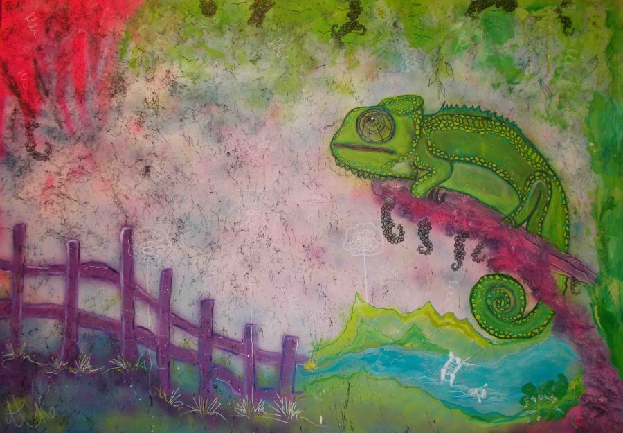 „Mein Chamäleon Pietri“, 140×200, Mischtechnik Acryl, Pan Pastel und diverse Marker auf Leinwand, verkauft
