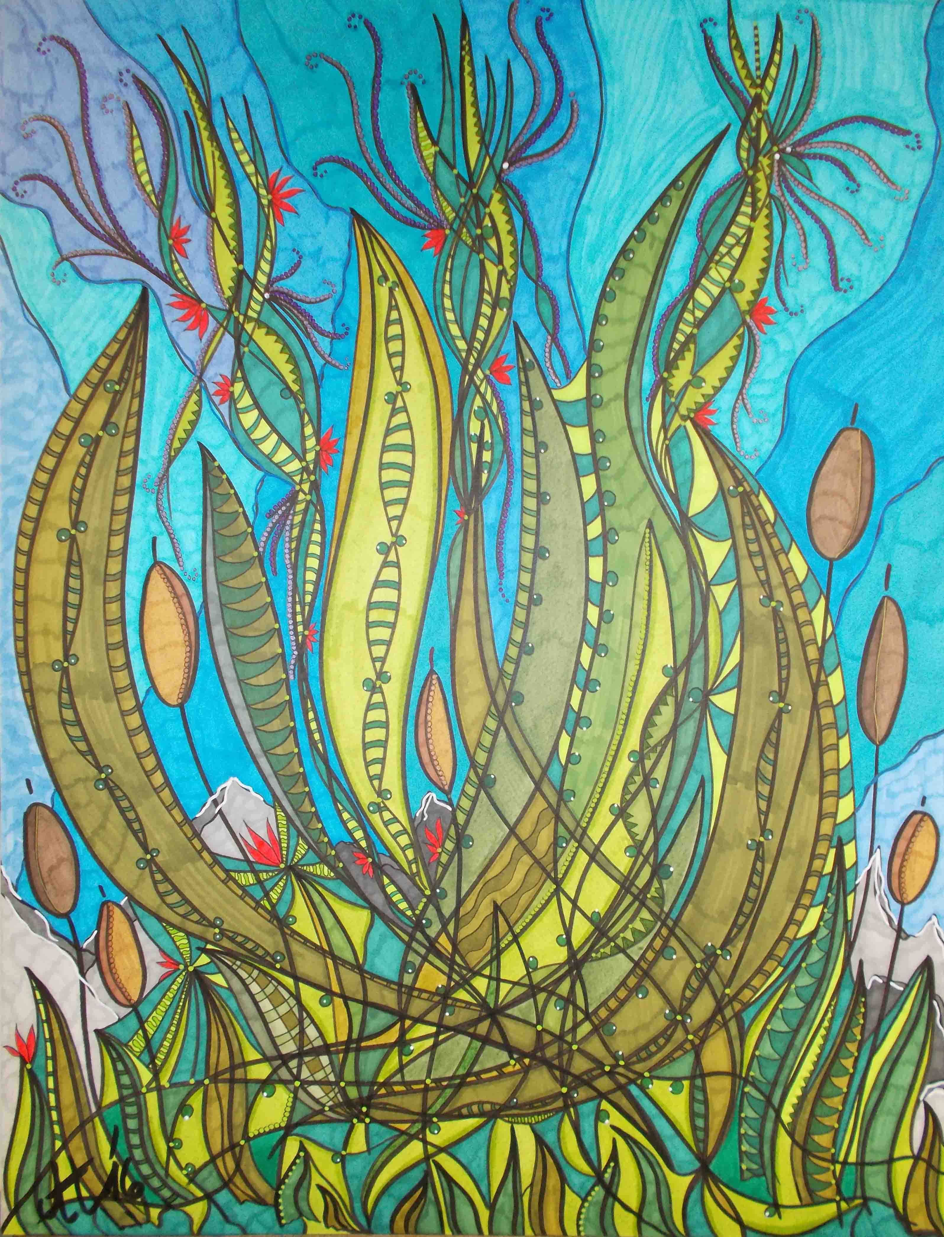 „Ruhe in Grün“, 60×50, diverse Marker auf Aquarellpapier, Preis auf Anfrage