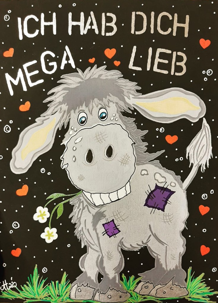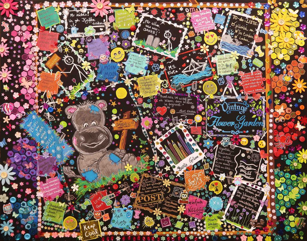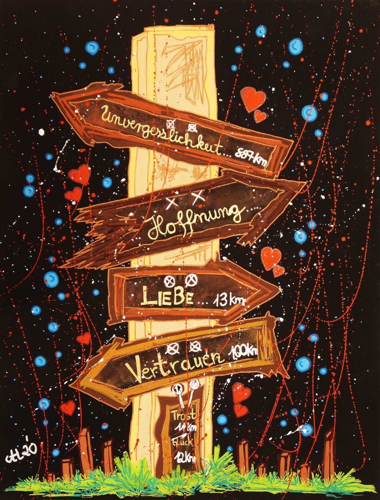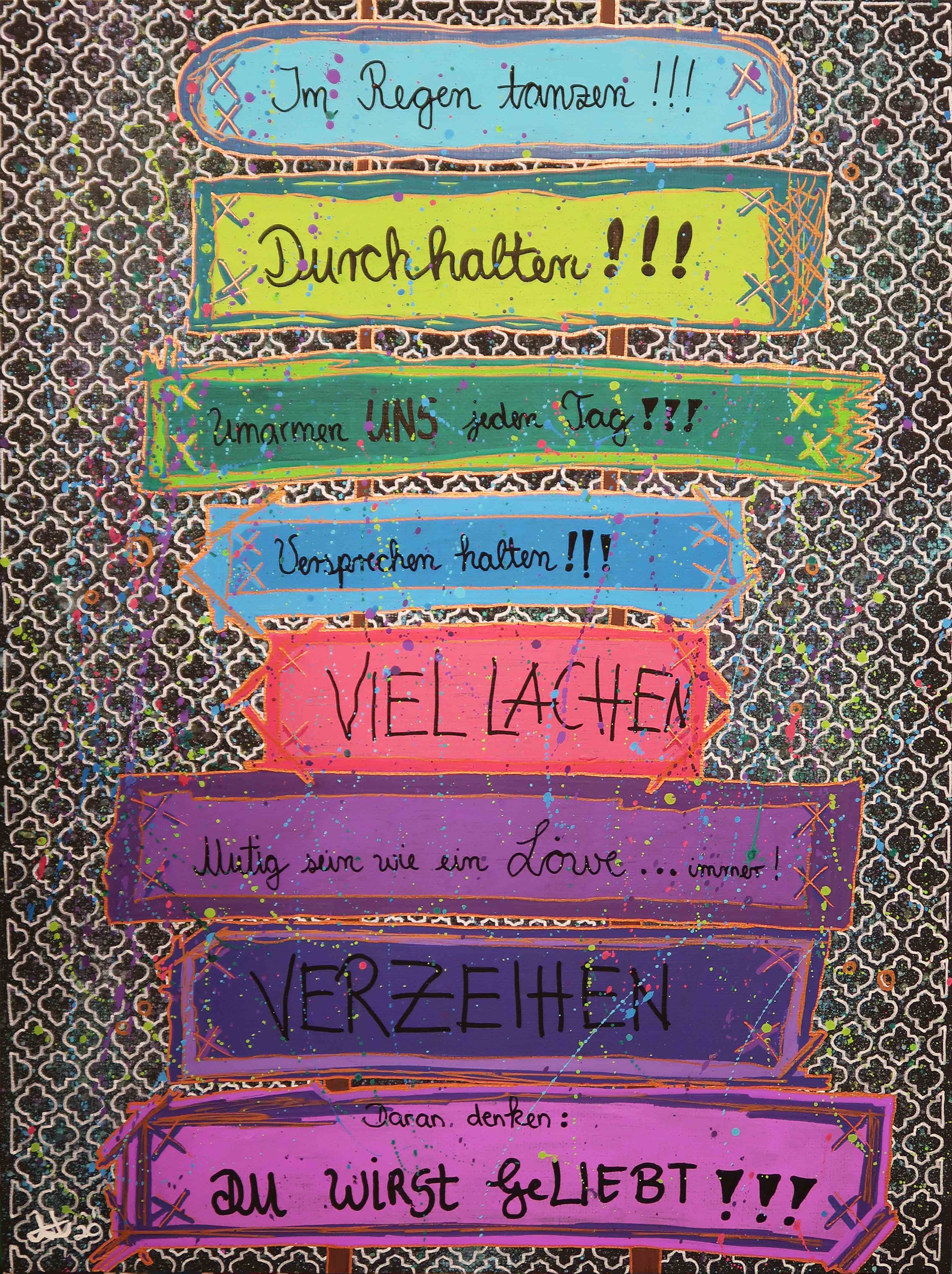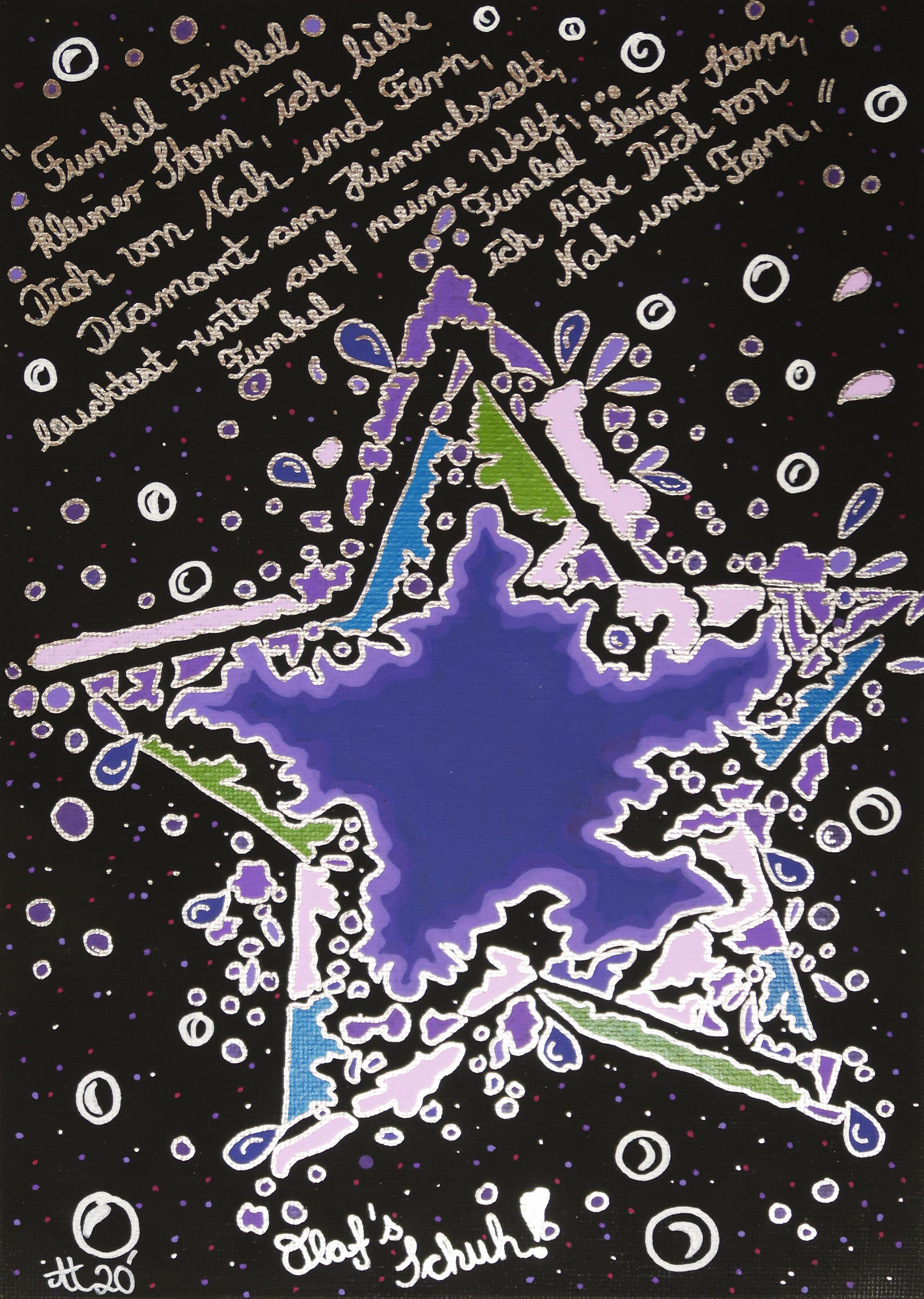„Auf in den Himmel 1“, 80×80, Acrylfarbe, Acrylstifte, Acrylspray, Glitzerfarbe, Pailletten und Streuglitzer auf schwarzer Leinwand, verkauft.„Auf in den Himmel 2“, 80×80, Acrylfarbe, Acrylstifte, Acrylspray, Glitzerfarbe und Streuglitzer auf schwarzer Leinwand, Preis auf Anfrage.„Verlorene Zeit“, 30×40, Acrylfarbe, Acrylstifte, Acrylspray, Glitzerfarbe und Streuglitzer auf schwarzer Malpappe, Preis auf Anfrage.„Vertraute Klänge“, 20×30, Acrylfarbe, Acrylstifte, Acrylspray, Glitzerfarbe, Pailletten und Streuglitzer auf schwarzem Malkaton, Preis auf Anfrage.„Stück für Stück 1“, 30×30, Acrylfarbe, Acrylstifte, Acrylspray, Glitzerfarbe und Streuglitzer auf schwarzer Malpappe, verkauft.„Stück für Stück 2“, 30×30, Acrylfarbe, Acrylstifte, Acrylspray, Glitzerfarbe und Streuglitzer auf schwarzer Malpappe, verkauft.„Stück für Stück 3“, 30×30, Acrylfarbe, Acrylstifte, Acrylspray, Glitzerfarbe und Streuglitzer auf schwarzer Malpappe, verkauft„Stück für Stück 4“, 30×30, Acrylfarbe, Acrylstifte, Acrylspray, Glitzerfarbe und Streuglitzer auf schwarzer Malpappe, verkauft„Stück für Stück 5“, 30×30, Acrylfarbe, Acrylstifte, Acrylspray, Glitzerfarbe und Streuglitzer auf schwarzer Malpappe, verkauft.„Stück für Stück 6“, 30×30, Acrylfarbe, Acrylstifte, Acrylspray, Glitzerfarbe und Streuglitzer auf schwarzer Malpappe, verkauft.„Stück für Stück 7“, 30×30, Acrylfarbe, Acrylstifte, Acrylspray, Glitzerfarbe und Streuglitzer auf schwarzer Malpappe, verkauft.„Das Herz am falschen Fleck 1“, 30×40, Acrylfarbe, Acrylstifte, Acrylspray, Glitzerfarbe und Streuglitzer auf schwarzer Malpappe, Preis auf Anfrage.„Das Herz am falschen Fleck 2“, 30×40, Acrylfarbe, Acrylstifte, Acrylspray, Glitzerfarbe und Streuglitzer auf schwarzer Malpappe, Preis auf Anfrage.„Kürbiskops JO“, 30×30, Acrylfarbe, Acrylstifte, Acrylspray, Glitzerfarbe und Streuglitzer auf schwarzer Malpappe, Preis auf Anfrage.„Kleiner Stern“, 20×30, Acrylfarbe, Acrylstifte, Acrylspray, Glitzerfarbe und Streuglitzer auf schwarzer Malpappe, Preis auf Anfrage.„Etwas Schnee“, 20×30, Acrylfarbe, Acrylstifte, Acrylspray, Glitzerfarbe und Streuglitzer auf schwarzer Malpappe, Preis auf Anfrage.„Etwas Gekritzel“, 20×20, Acrylfarbe, Acrylstifte, Acrylspray, Glitzerfarbe und Streuglitzer auf schwarzer Malpappe, Preis auf Anfrage.„Süsses“, 40×40, Acrylfarbe, Acrylstifte, Acrylspray, Glitzerfarbe und Streuglitzer auf schwarzer Malpappe, Preis auf Anfrage.„Knirps Drachenherz“, 40×40, Acrylfarbe, Acrylstifte, Acrylspray, Glitzerfarbe und Streuglitzer auf schwarzer Malpappe, Preis auf Anfrage.„Kaktus..eee“, 30×40, Acrylfarbe, Acrylstifte, Acrylspray, Glitzerfarbe und Streuglitzer auf schwarzer Malpappe, Preis auf Anfrage.„Die bunten Sterne“, 20×30, Acrylfarbe, Acrylstifte, Acrylspray, Glitzerfarbe und Streuglitzer auf schwarzer Malpappe, Preis auf Anfrage.„Die 1.te Kachel“, 15×15, Acrylfarbe, Acrylstifte, Acrylspray, Glitzerfarbe und Streuglitzer auf schwarzer Malpappe, Preis auf Anfrage.„Als Kind träumte ich vom Mann im Mond“, 30×40, Acrylfarbe, Acrylstifte, Acrylspray, Glitzerfarbe und Streuglitzer auf schwarzer Malpappe, Preis auf Anfrage.„Vergessen“, 20×30, Acrylfarbe, Acrylstifte, Acrylspray, Glitzerfarbe und Streuglitzer auf schwarzer Malpappe, Preis auf Anfrage.„Past Times“, 20×20, Acrylfarbe, Acrylstifte, Acrylspray, Glitzerfarbe und Streuglitzer auf schwarzer Malpappe, Preis auf Anfrage.„Gefundenes“, 30×40, Acrylfarbe, Acrylstifte, Acrylspray, Glitzerfarbe und Streuglitzer auf schwarzer Malpappe, Preis auf Anfrage.„Familie“, 30×40, Acrylfarbe, Acrylstifte, Acrylspray, Glitzerfarbe und Streuglitzer auf schwarzer Malpappe, Preis auf Anfrage.„Gewimmel 1“, 30×40, Acrylfarbe, Acrylstifte, Acrylspray, Glitzerfarbe und Streuglitzer auf schwarzer Malpappe, Preis auf Anfrage.„Gewimmel 2“, 30×40, Acrylfarbe, Acrylstifte, Acrylspray, Glitzerfarbe und Streuglitzer auf schwarzer Malpappe, Preis auf Anfrage.„Bunte Geduld“, 40×40, Acrylfarbe, Acrylstifte, Acrylspray, Glitzerfarbe und Streuglitzer auf schwarzer Malpappe, Preis auf Anfrage.„Dream Time“, 30×40, Acrylfarbe, Acrylstifte, Acrylspray, Glitzerfarbe und Streuglitzer auf schwarzer Malpappe, Preis auf Anfrage.„Karten“, 30×40, Acrylfarbe, Acrylstifte, Acrylspray, Glitzerfarbe und Streuglitzer auf schwarzer Malpappe, Preis auf Anfrage.„Herbstlicher Ginkgo“, 40×40, Acrylfarbe, Acrylstifte, Acrylspray, Glitzerfarbe und Streuglitzer auf schwarzer Malpappe, unverkäuflich.„Kurzes Heimweh“, 30×40, Acrylfarbe, Acrylstifte, Acrylspray, Glitzerfarbe und Streuglitzer auf schwarzer Malpappe, Preis auf Anfrage.„BUNTES Nichts“, 20×30, Acrylfarbe, Acrylstifte, Acrylspray, Glitzerfarbe und Streuglitzer auf schwarzer Malpappe, Preis auf Anfrage.„An GOLDENEN Fäden“, 50×100, Acrylfarbe, Acrylstifte, Acrylspray, Glitzerfarbe und Streuglitzer auf schwarzer Leinwand, Preis auf Anfrage.„Auf Bestellung“, 80×100, Acrylfarbe, Acrylstifte, Acrylspray, Glitzerfarbe und Streuglitzer auf schwarzer Leinwand, Preis auf Anfrage.„Der freche Esel Hogo“, 30×40, Acrylfarbe, Acrylstifte, Acrylspray, Glitzerfarbe und Streuglitzer auf schwarzer Malpappe, Preis auf Anfrage.„148“, 20×30, Acrylfarbe, Acrylstifte, Acrylspray, Glitzerfarbe und Streuglitzer auf schwarzer Malpappe, Preis auf Anfrage.„Kleine Meerjungfrau“, 20×30, Acrylfarbe, Acrylstifte, Acrylspray, Glitzerfarbe und Streuglitzer auf schwarzer Malpappe, Unverkäuflich.„Lächeln ist gratis“, 20×20, Acrylfarbe, Acrylstifte, Acrylspray, Glitzerfarbe und Streuglitzer auf schwarzer Malpappe, Preis auf Anfrage.„Tik Tak Tooo“, 20×20, Acrylfarbe, Acrylstifte, Acrylspray, Glitzerfarbe und Streuglitzer auf schwarzer Malpappe, Preis auf Anfrage.„147“, 30×30, Acrylfarbe, Acrylstifte, Acrylspray, Glitzerfarbe und Streuglitzer auf schwarzer Malpappe, unverkäuflich.„DIE Bekloppte un