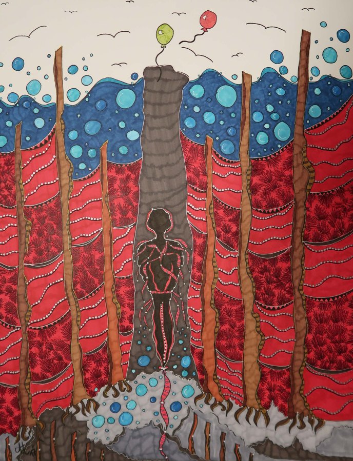 „Verschwunden“, 65×50, diverse Marker auf Aquarellpapier, ausgestellt an der Artstages