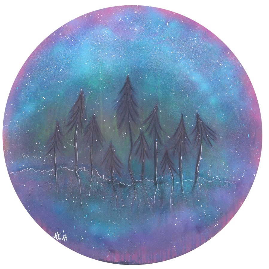 „Farben in der Nacht“, 80cm Durchmesser, Acryl, Pastell und Marker auf Leinwand, Preis auf Anfrage