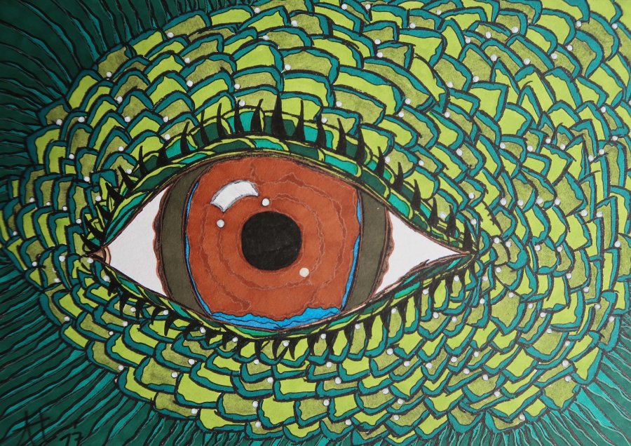 „Chamäleon-Grün“, 17×24, diverse Marker auf Papier, Preis auf Anfrage.