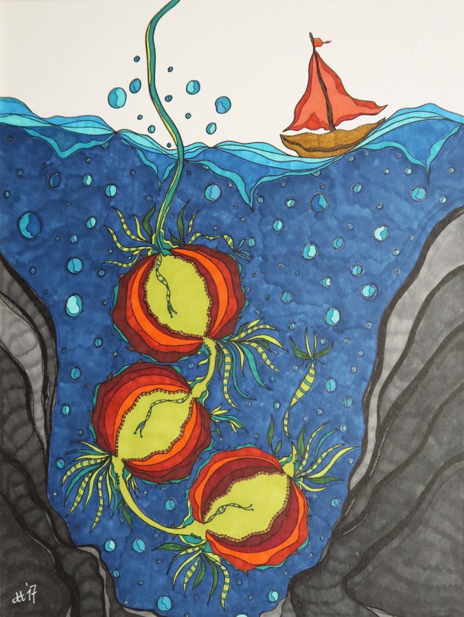 „Der versunkene Neuanfang“, 36×48, diverse Marker auf Papier, Preis auf Anfrage.