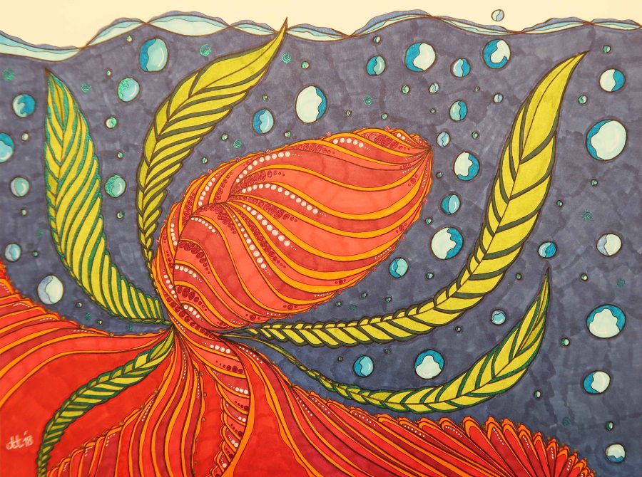„Unter Wasser“, 40.8×30.4, diverse Marker auf Papier, Preis auf Anfrage.