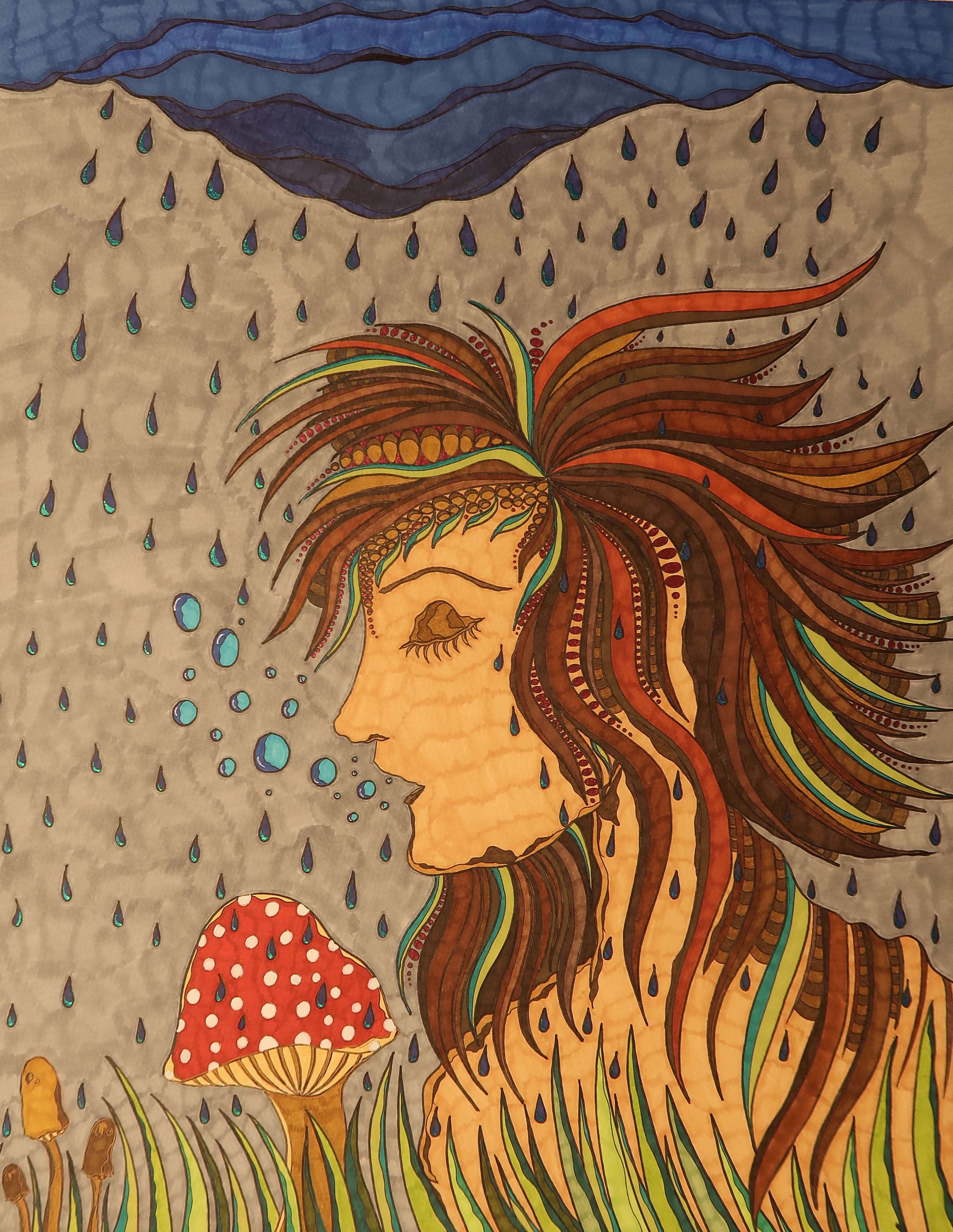 „Alleine im Regen“, 50×65, diverse Marker auf Papier, Preis auf Anfrage.
