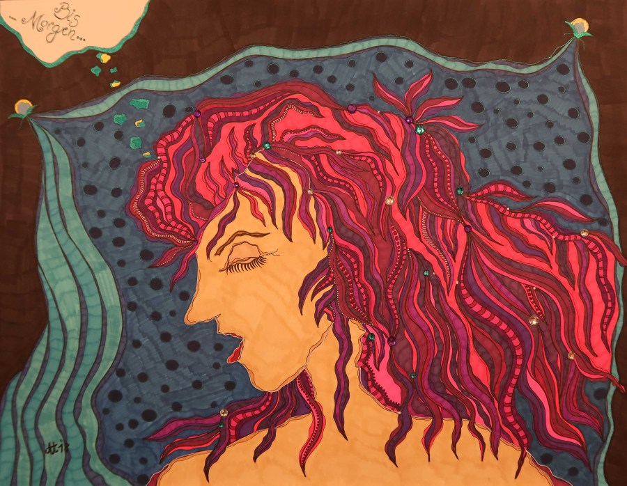 „Mein geliebter Theodora“, 50×65, diverse Marker auf Papier, Preis auf Anfrage.