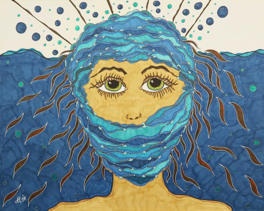 „Sprachlos in Blau“, 40.6×50.8, diverse Marker auf Papier, Preis auf Anfrage.