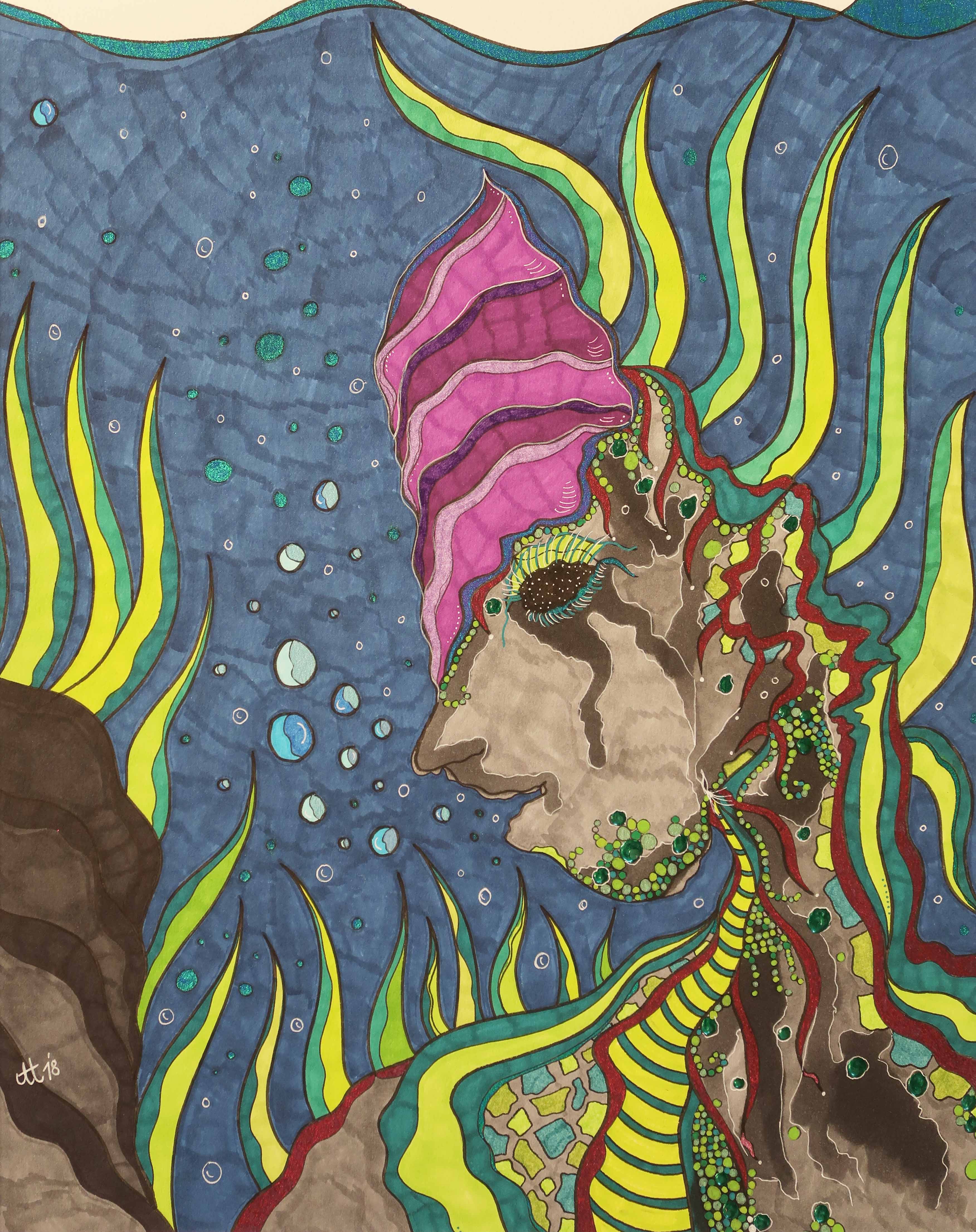 „Versteinert im Meer“, 40.6×50.8, diverse Marker auf Papier, Preis auf Anfrage.