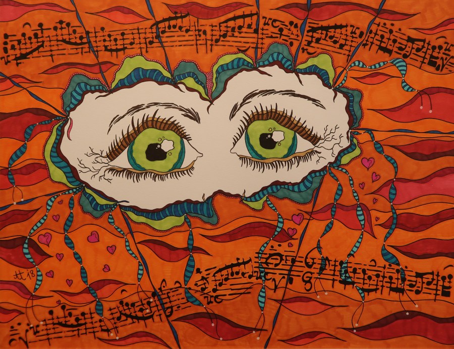 „Musikalischer Moment“, 50×65, diverse Marker auf Papier, Preis auf Anfrage.