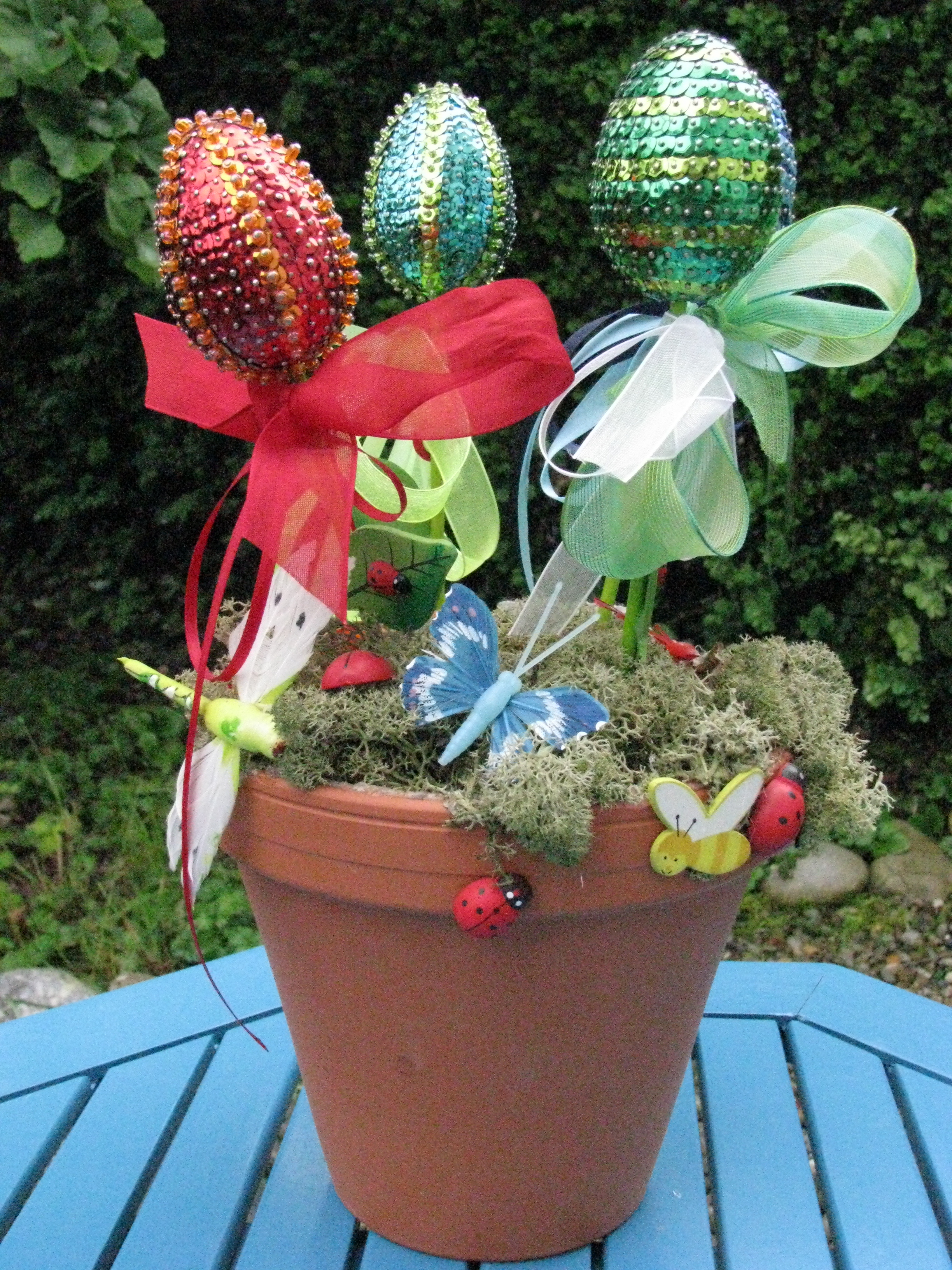Material: Styropor-Rohling Eier, Pailletten (verschiedenfarbig), Stecknadeln 14 mm und 18 mm, Schleifenband, Steckmoos, Topf, Dekoschmetterlinge, Dekommarienkäfer. Preis auf Anfrage