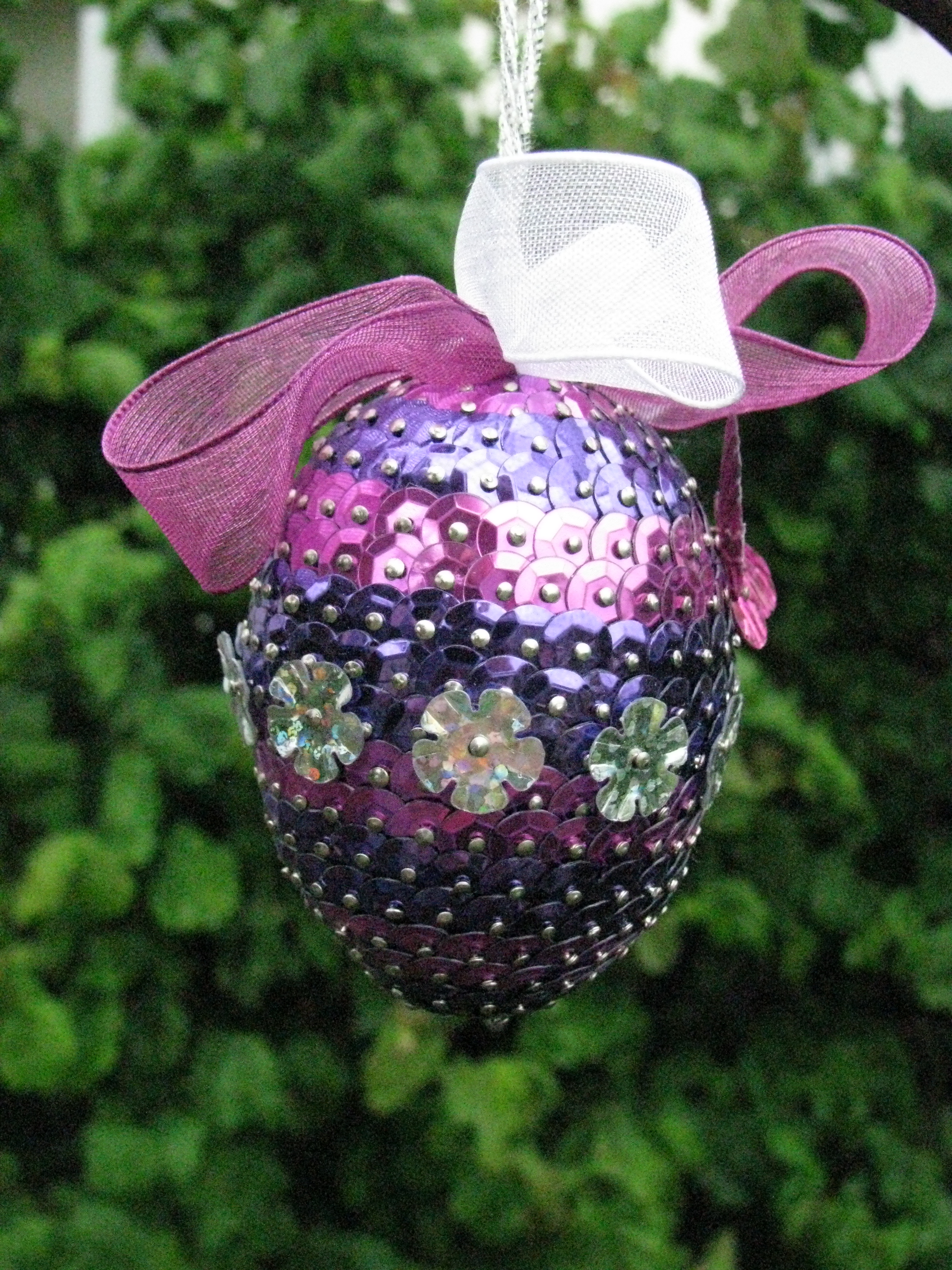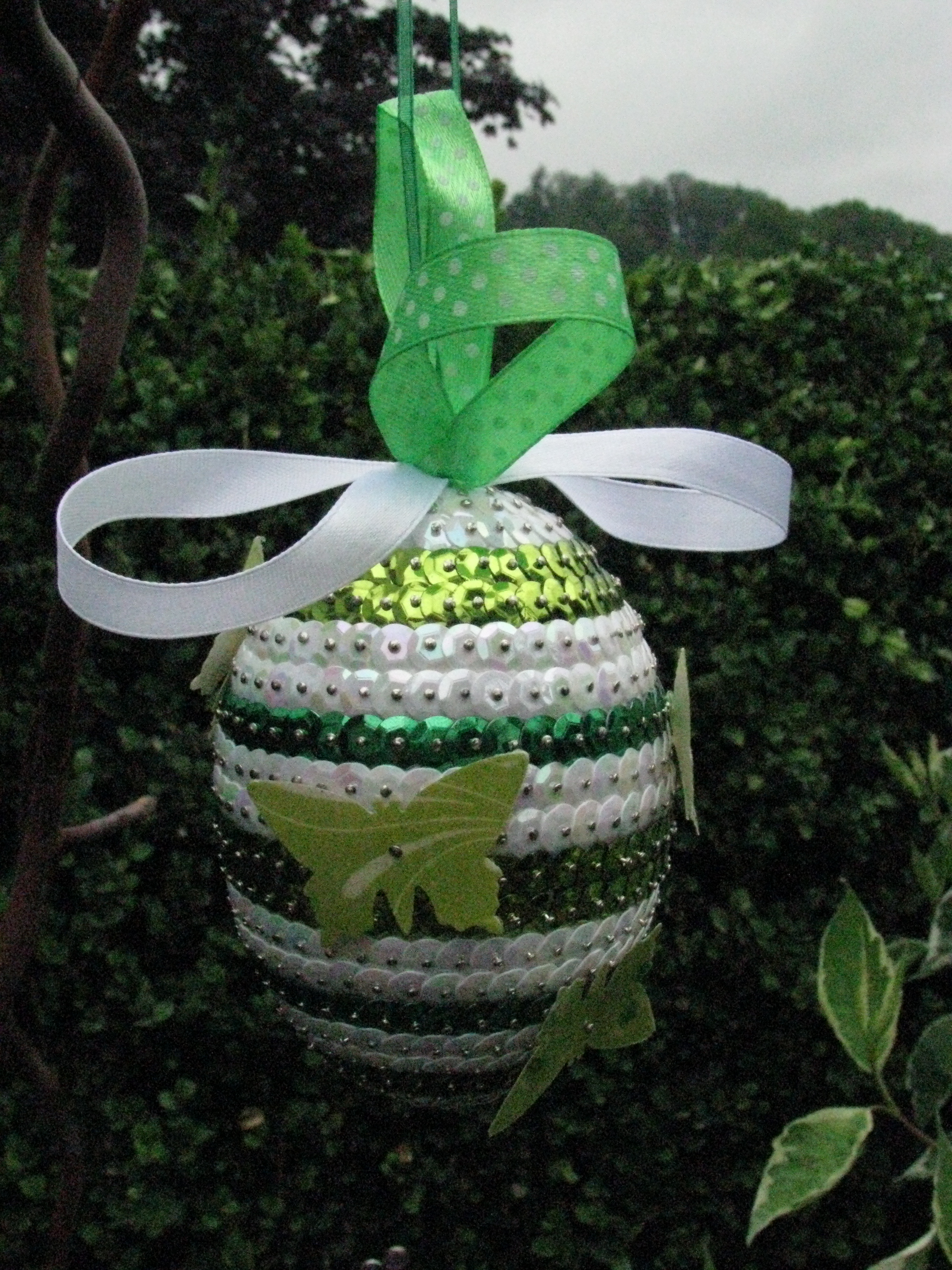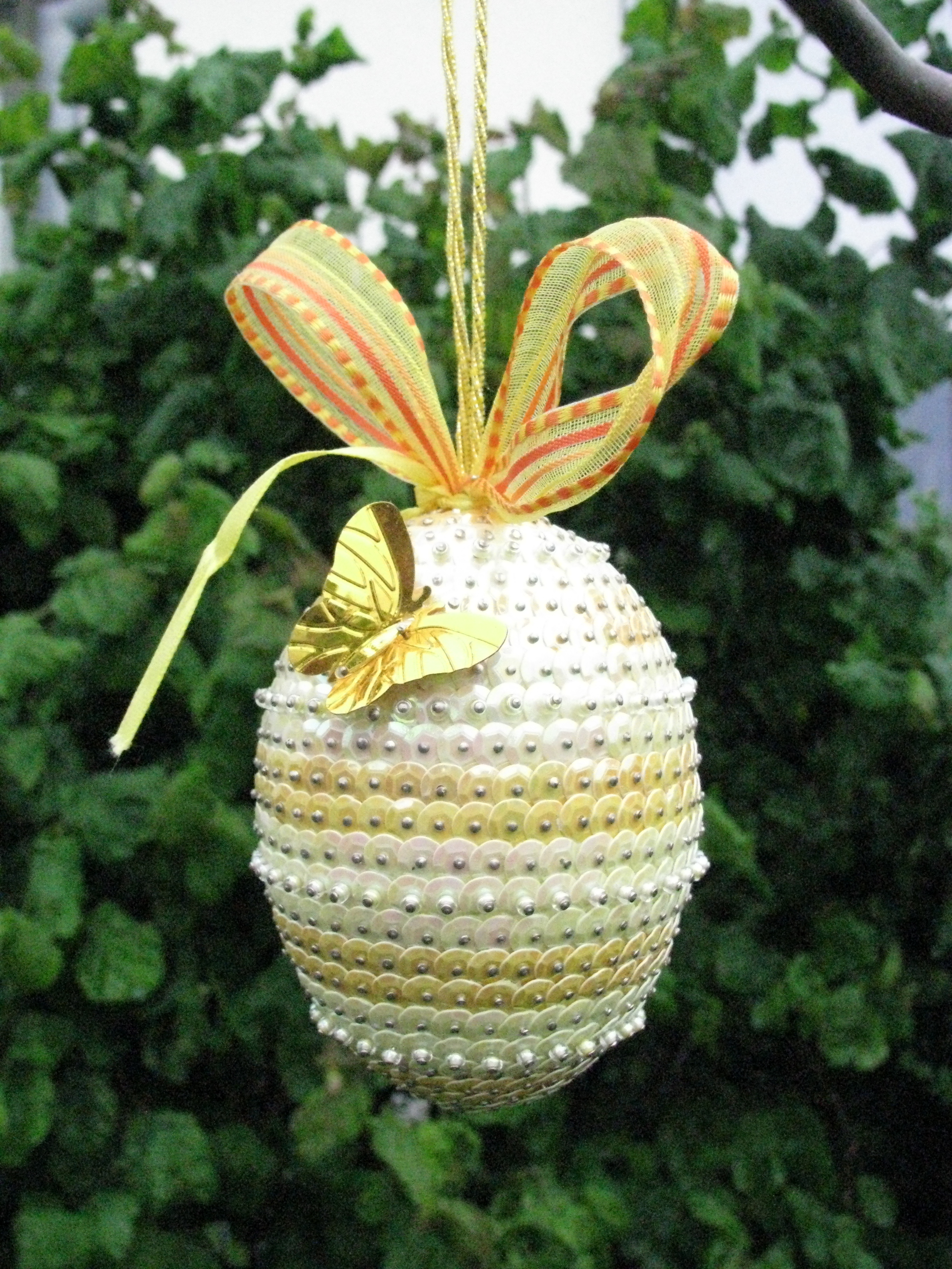 Material: Styropor-Rohling Ei 30cm, Pailletten (grün, lila, pink), Schleifenband, Stecknadeln 14 mm und 18 mm, Schmetterlinge. Preis auf Anfrage