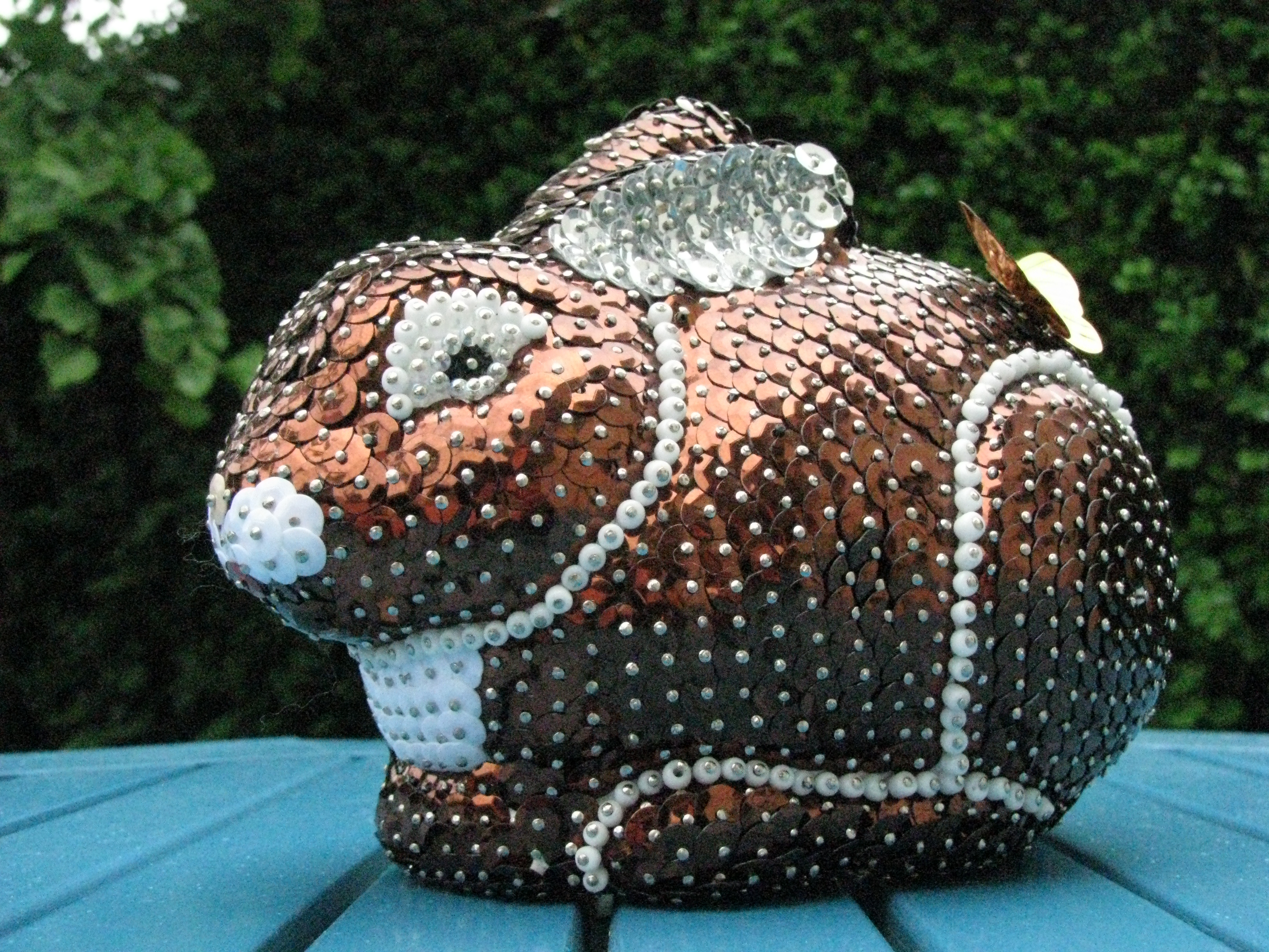Material: Styropor-Rohling Hase, Pailletten (bronze, silber, weiss, schwarz), Perlen (weiss und gelüstert weiss), Stecknadeln 14mm und 18mm, 1 Schmetterling. Preis auf Anfrage