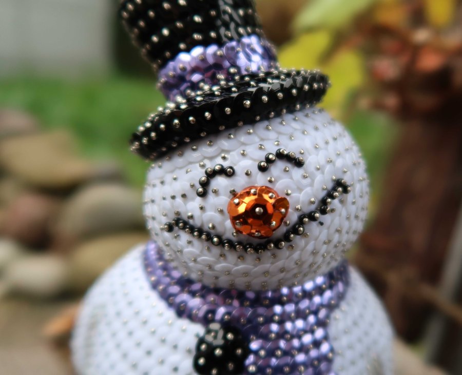„Schneemann“, 15 cm, Pailletten, Perlen und Nadeln auf Styroporrohling, Preis auf Anfrage